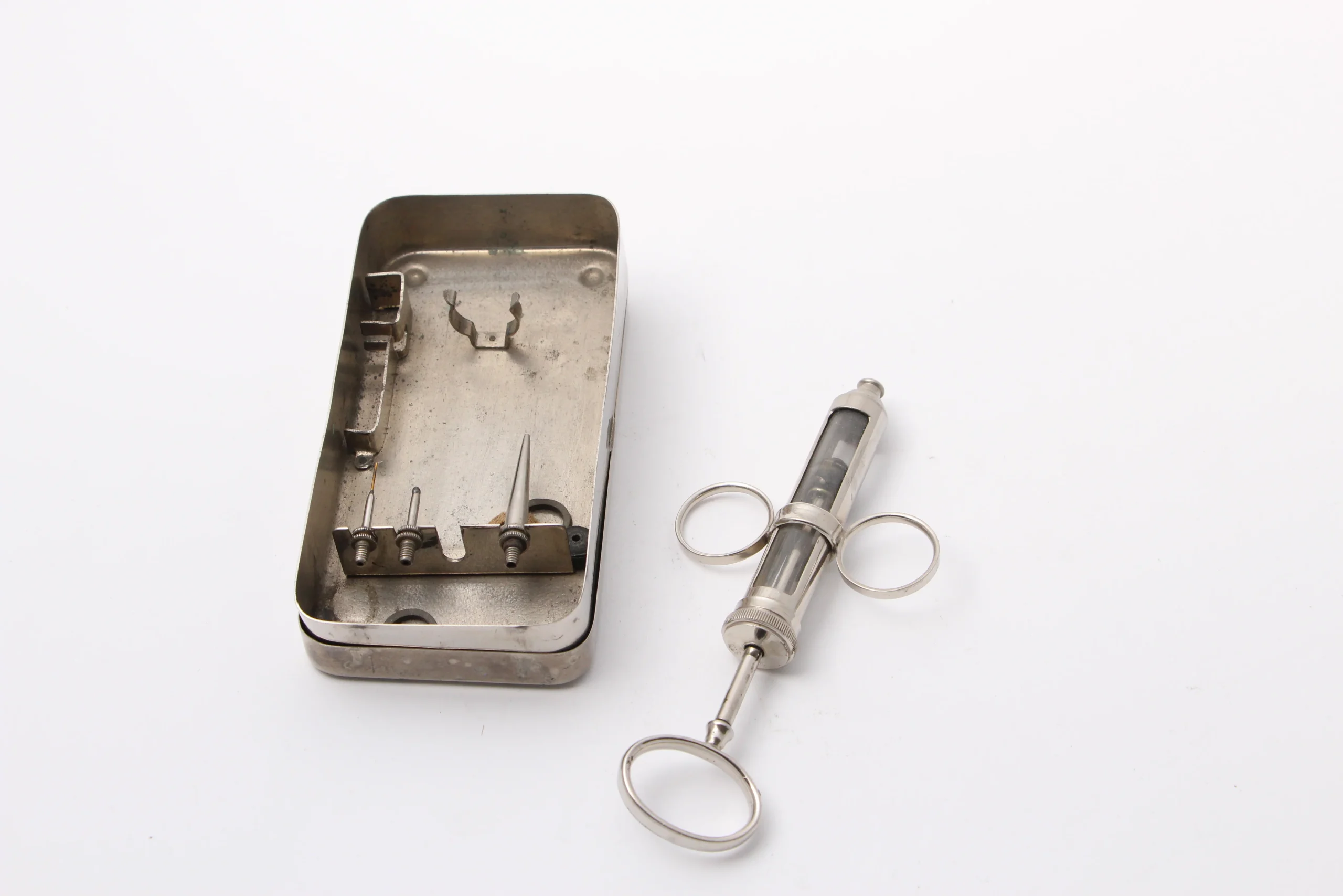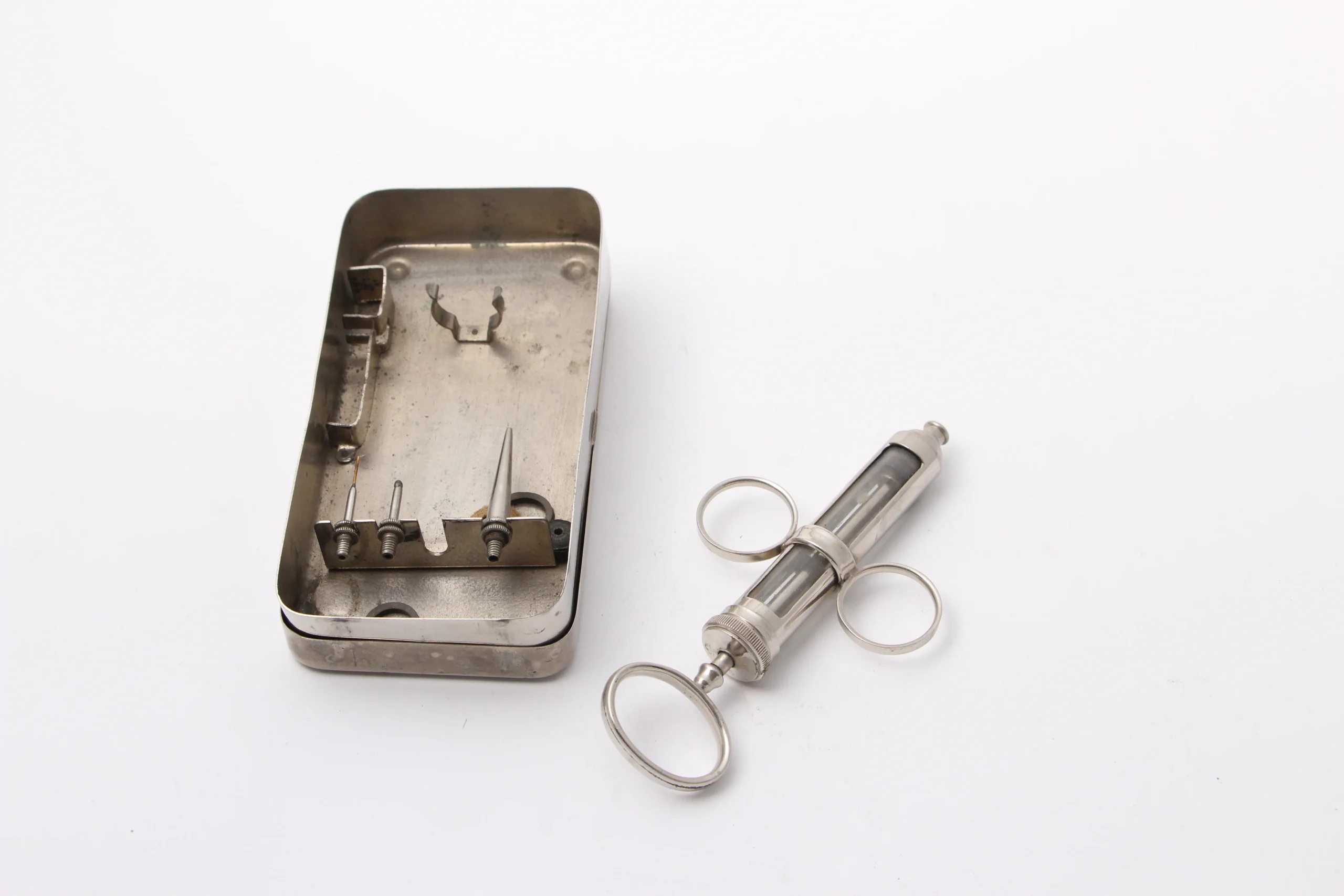 Jeringa con carcasa y émbolo metálicos y anillos laterales para aumentar la presión. En caja metálica que se podía esterilizar en autoclave o usarse como hervidor. Con varias cánulas de diferentes modelos.