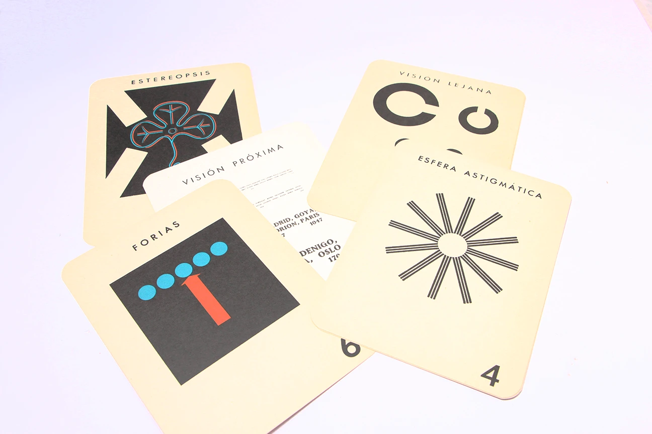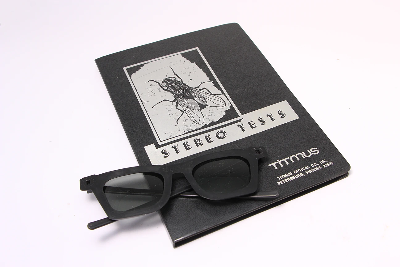 Test TITMUS para la exploración de la visión estereoscópica con sus gafas y algunas de las láminas incluidas en el equipo. Conocido vulgarmente como el test de la mosca.