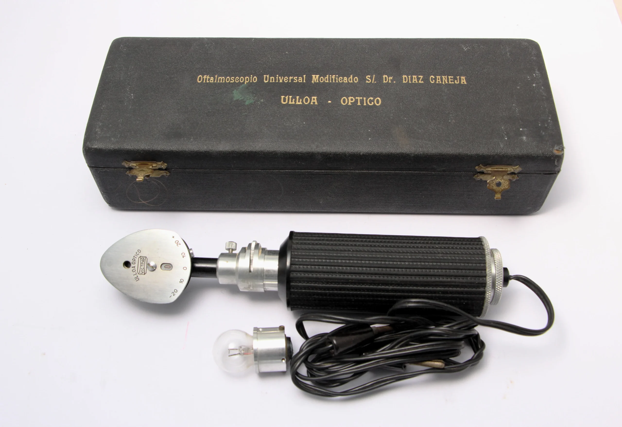 Oftalmoscopio Ulloa Óptico con estuche. Falta el transformador. Como muchos de los equipos de esa empresa, fundada en 1919 y que aún sigue activa, formaba parte de la dotación de la mayoría de las consultas, tanto públicas como privadas en el último tercio del siglo XX. Eran aparatos duros, de fácil mantenimiento y a un precio muy asequible.