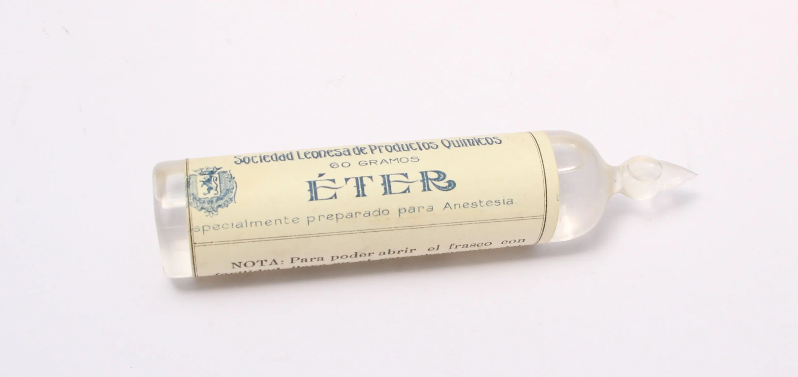 Vial de Éter para anestesia de la Sociedad Leonesa de productos químicos. Se aplicaba directamente empapando una torunda y aplicándolo con una mascarilla.