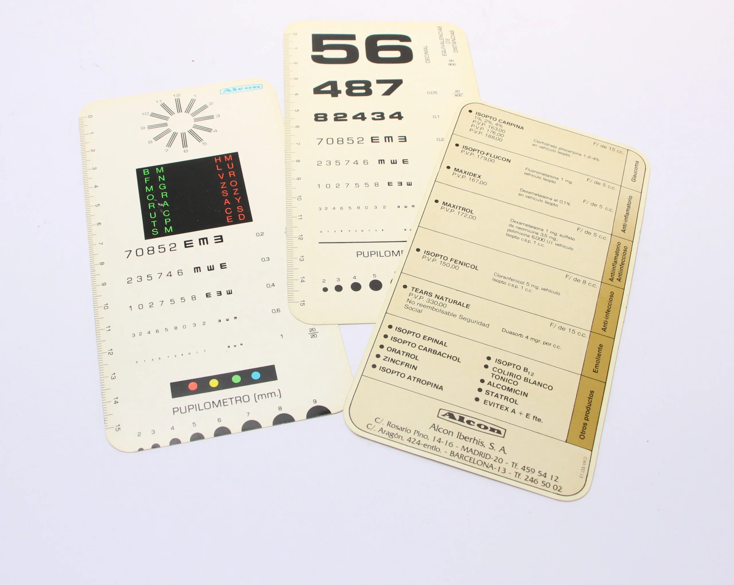 Optotipos para visión próxima, con pupilómetro y tablas de colores, diseñados por Laboratorios Alcon como ayuda en la consulta y como soporte publicitario.