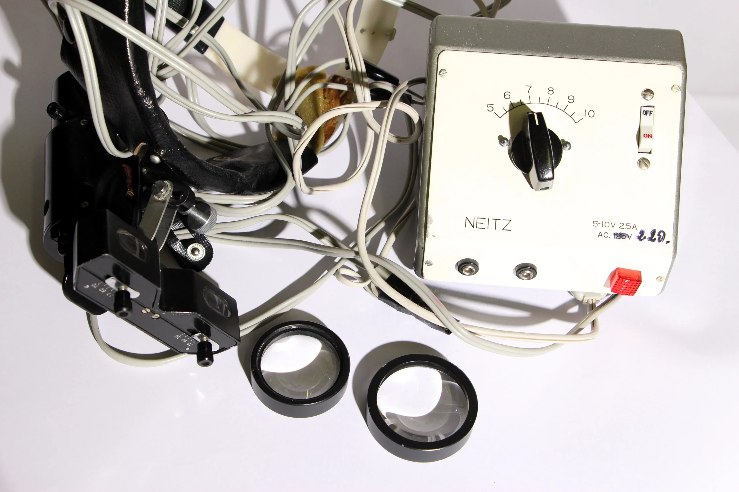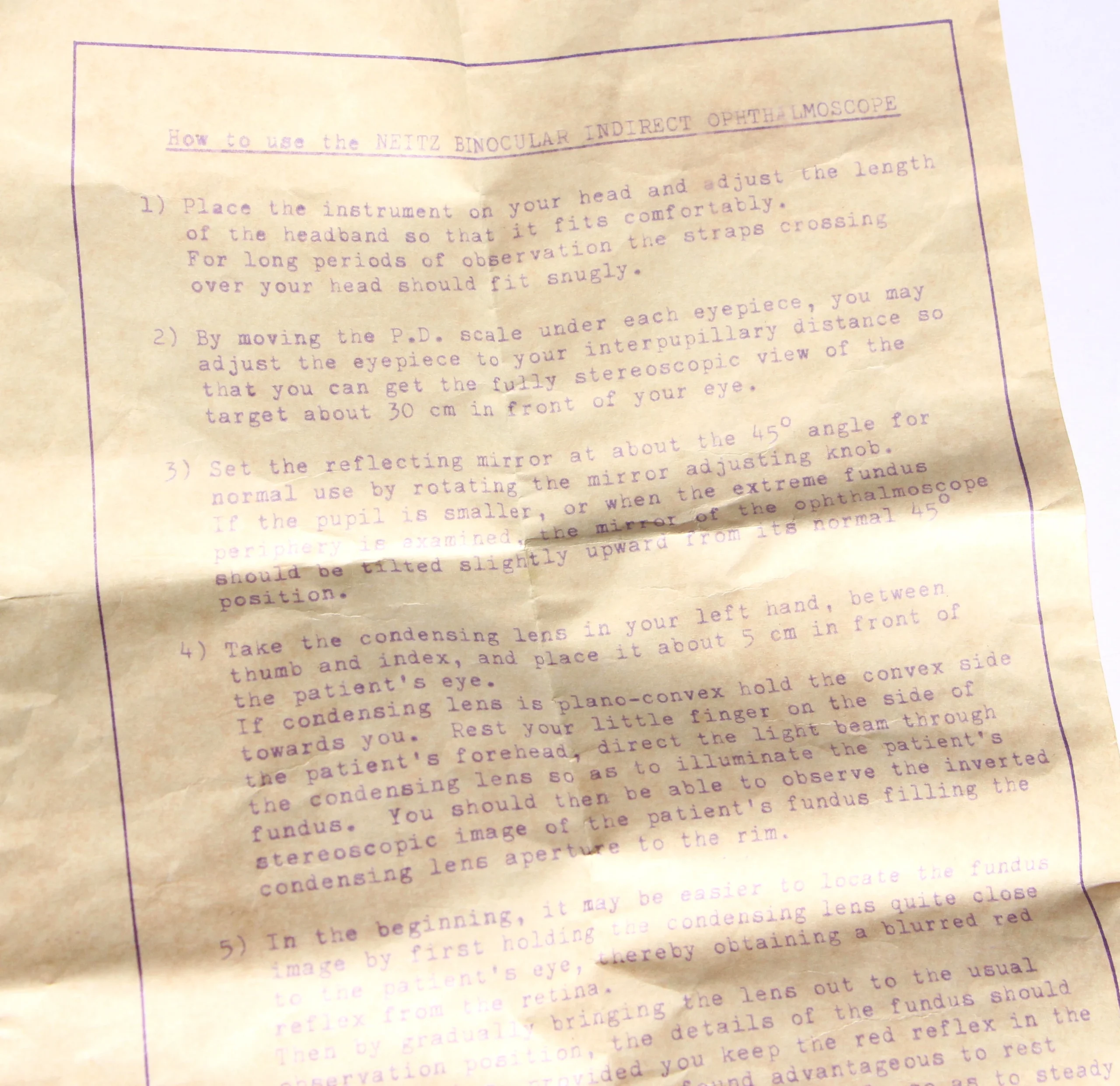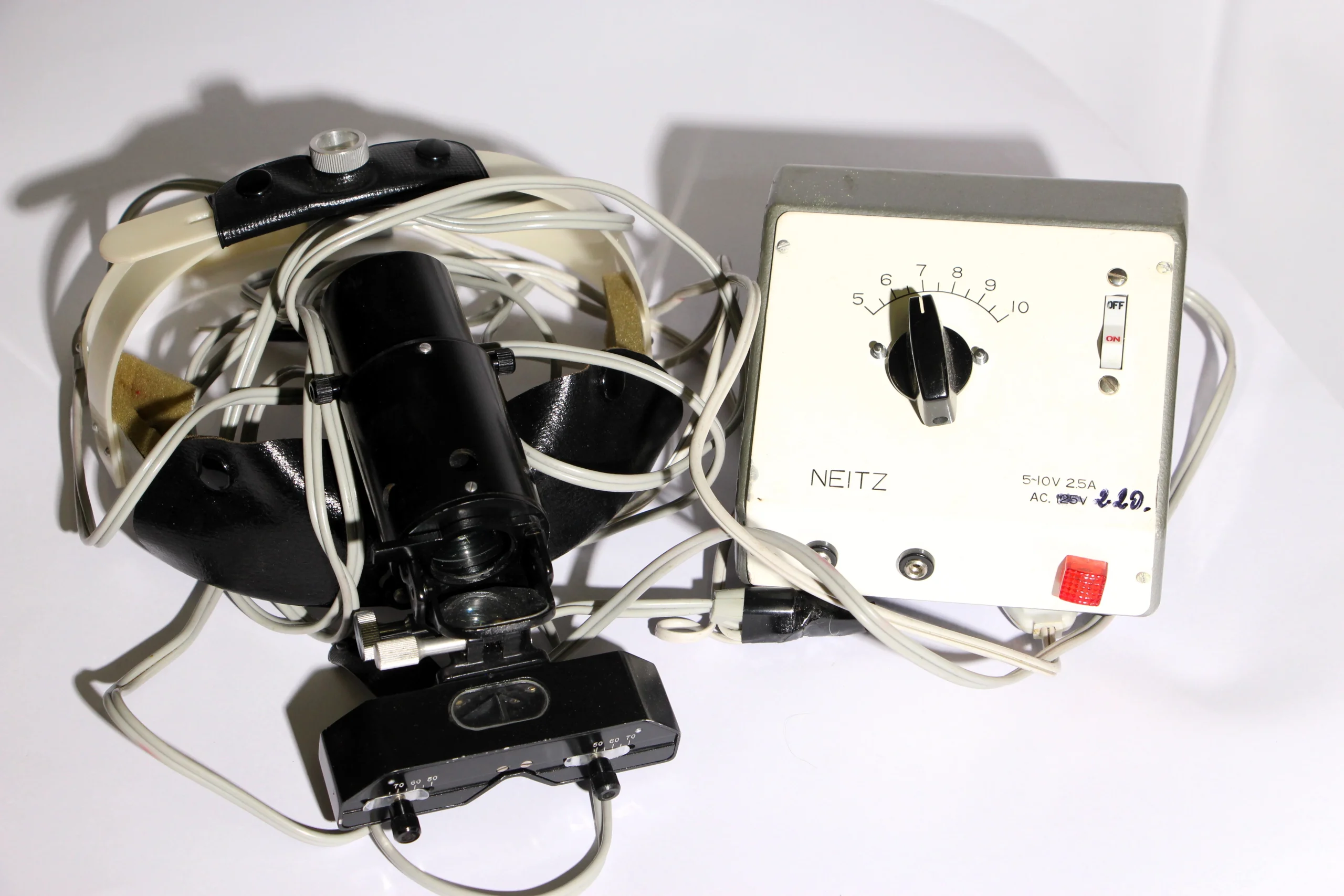 Oftalmoscopio indirecto, Marca Neitz adaptado a 220 V., con maletín, lentes de exploración y certificado de garantía.