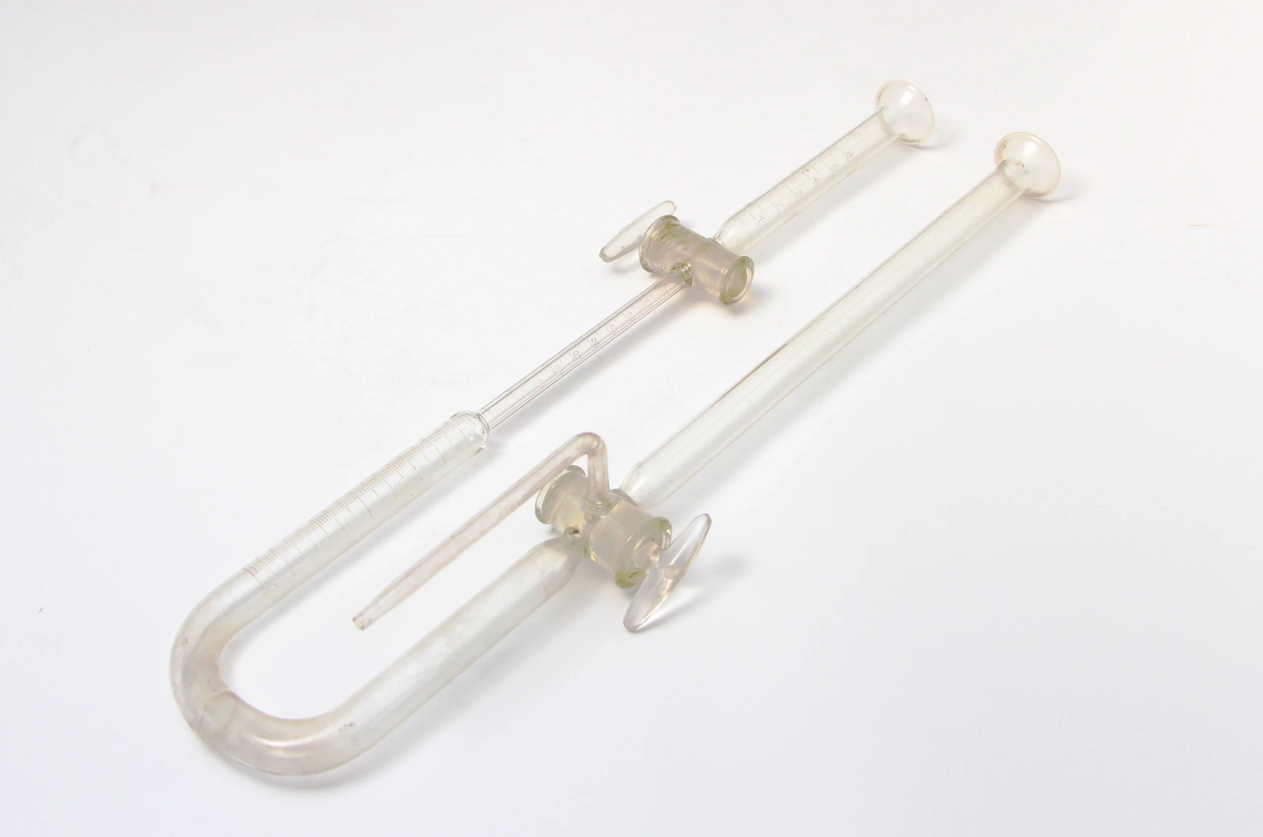 Bureta calibrada de laboratorio con llaves de vidrio, utilizada para la determinación de urea en sangre.