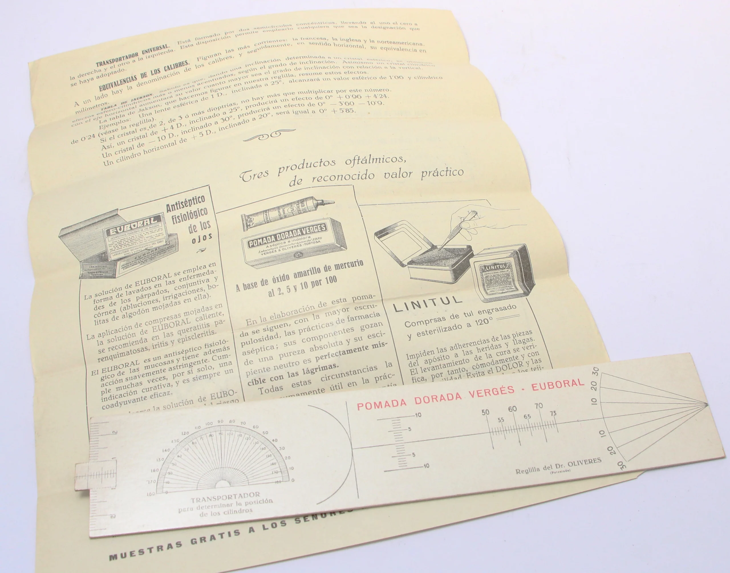 Regla del Dr. Oliveres para la medición de la distancia interpupilar. Publicidad de Laboratorios Vergés.