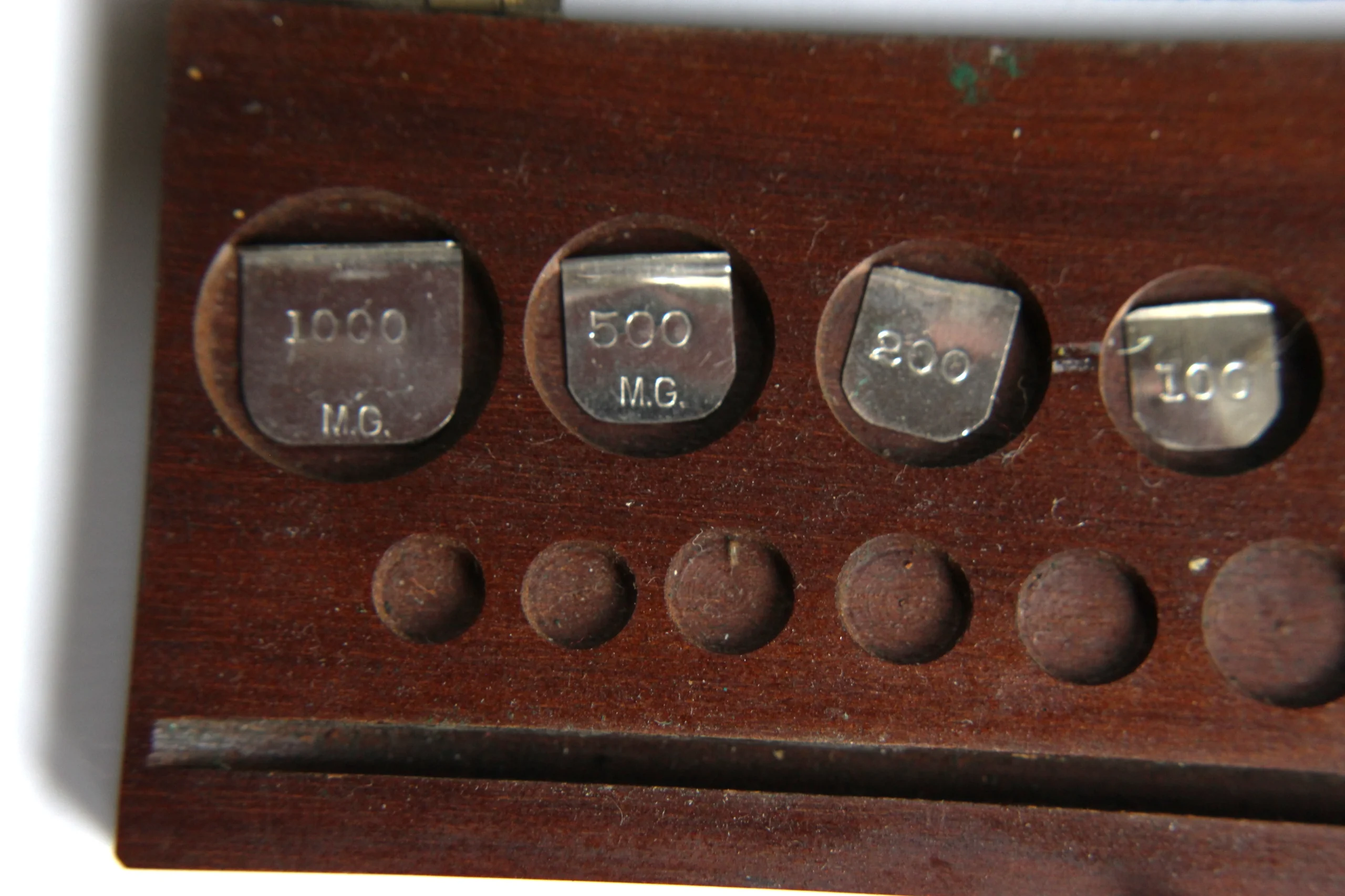 Estuche de madera con pesas de microgramos para ser utilizadas en balanzas de precisión. Incluye una pinza para su manejo.