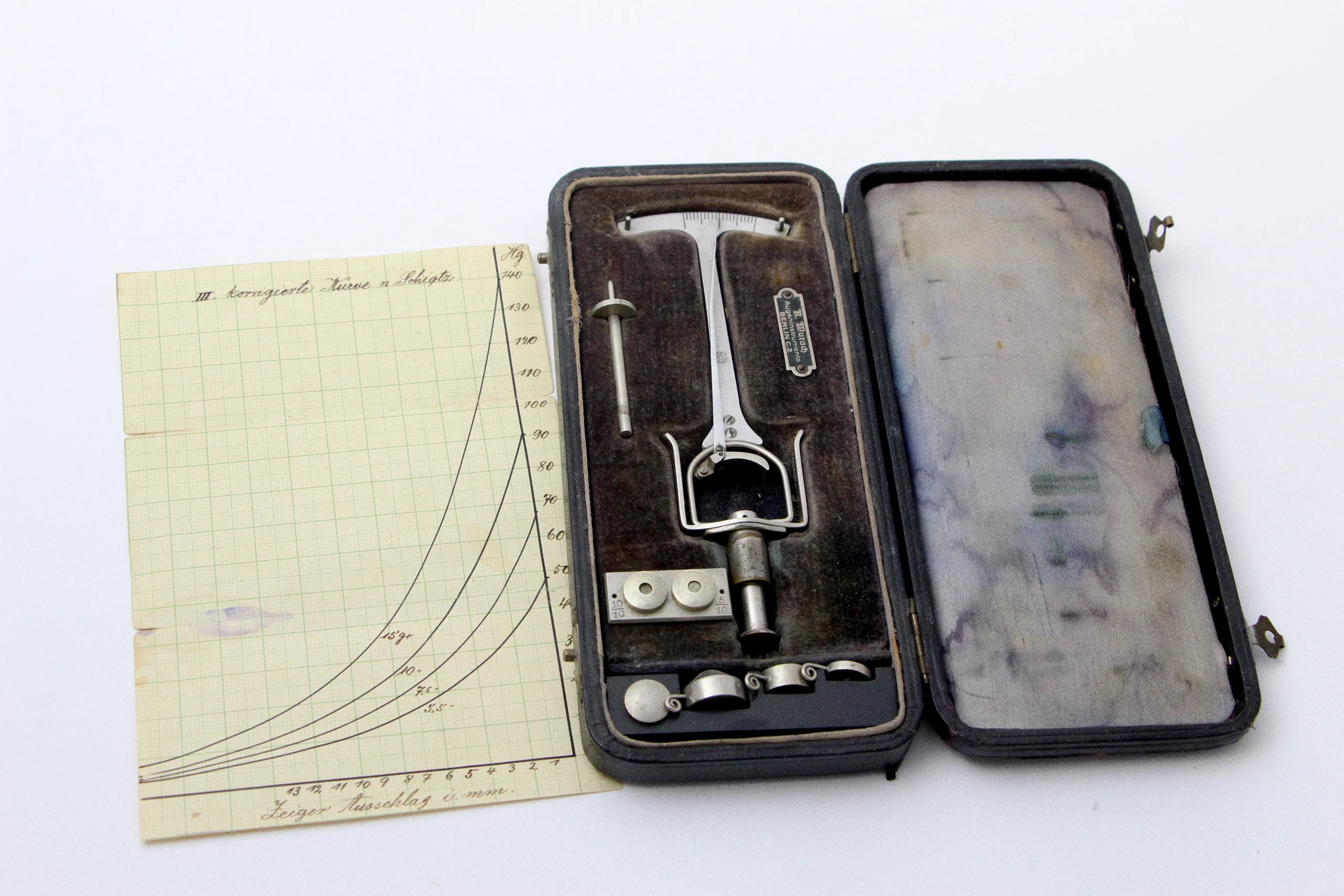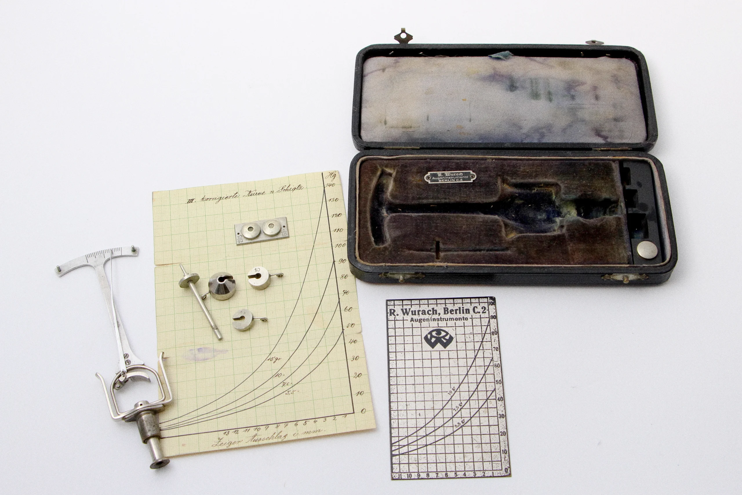 Tonómetro de Schiötz, Marca M. Durach de Berlín, en su estuche de madera, con pesas de 5,5, 7,5 y 10, dos discos de calibración y gráficas para la medida.
